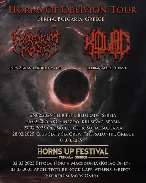 We’re also helping spread the word about Exordium Mors‘ first European tour, which will begin in February and includes an appearance at the Horns Up Festival in Greece. Here’s the current schedule: