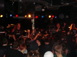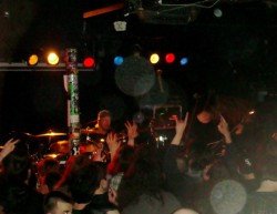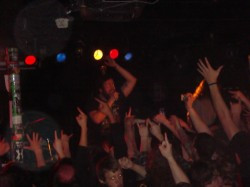The house was completely packed by this point, and basically the entire floor turned into one roiling pit from start to finish, like a school of piranhas with a haunch of meat tossed in their midst. And the crowd-surfing and stage-diving never let up either. It was like the gymnastics event at the Death Metal Olympics.