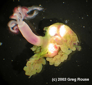 Asked why these worms might have evolved such an unusual method of reproduction, Vrijenhoek suggests, “These worms appear to be the ecological equivalent of dandelions—a weedy species that grows rapidly, makes lots of eggs, and disperses far and wide.” This strategy makes sense when you consider that after a whale skeleton has been consumed, all the worms at that site will die off. Before this happens, they must release enough eggs or larvae so that some tiny proportion will be transported by the ocean currents until they can find and colonize another whale carcass.