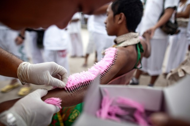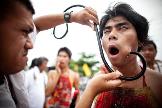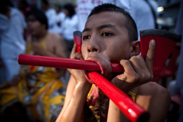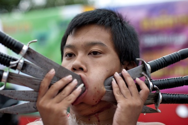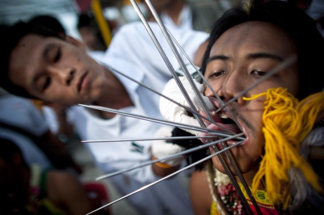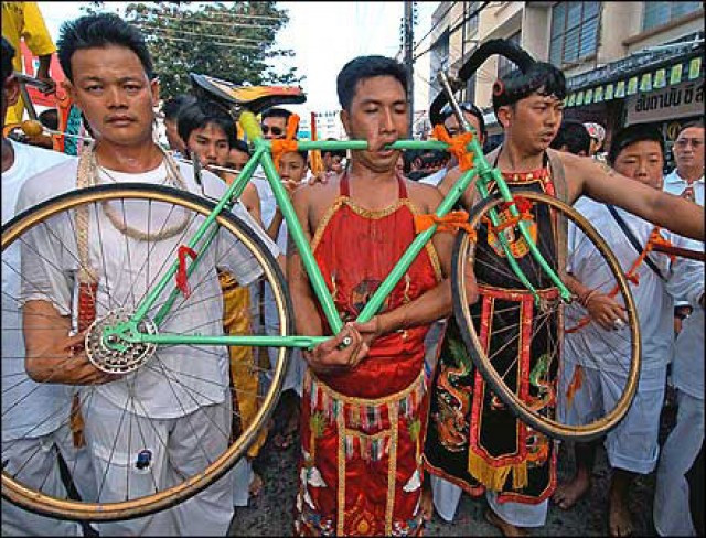 As explained in a recent DMB post, a religious event called The Vegetarian Festival is now in full swing on the island of Phuket in southern Thailand. (We believe that name is pronounced poo-ket, but fuckit, the pronunciation doesn’t really matter for our purposes.) This festival involves some unusual forms of religious observation. As explained in this article on one of the Phuket web sites:
