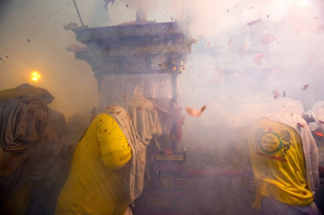 Don’t be misled into thinking that you have to gouge your face with large objects in order to enjoy the Vegetarian Festival in Phuket. You can have just as much fun carrying small gods on a litter and having them go off like land mines right behind your head. Sure, your ears will bleed and you’ll be concussed for a few days, but at least you can drink beer without having it jet through your cheeks like water from a firehose.