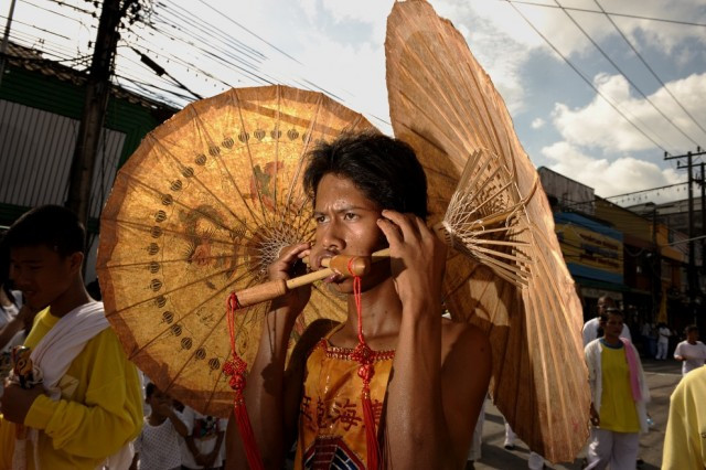 Perhaps the most visual of these rituals are the displays of extreme body piercings with large objects that can range from knives to umbrellas. Devotees, called ma song, may even partake in walking over hot coals barefoot or climbing up ladders that have rungs made of knife blades. Visitors can see the ma song walking in their trances during long parades through the streets on every day of the festival.