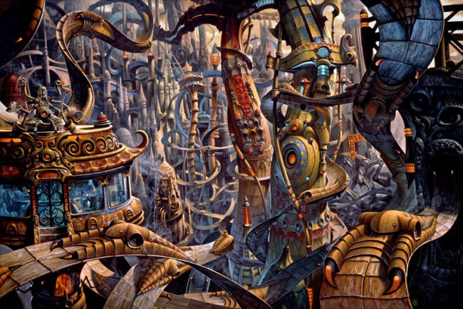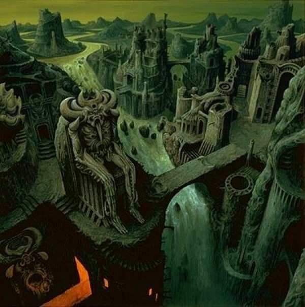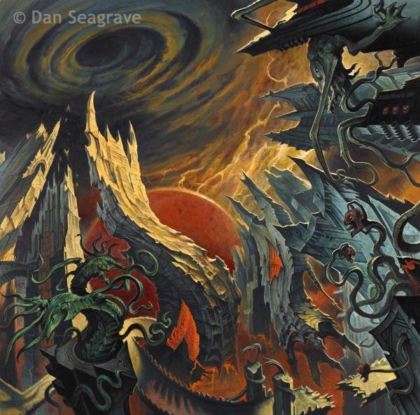 Before we get to the Invection music and more of Master Seagrave’s art, here’s a Seagrave painting that isn’t an album cover but is gobsmackingly good. It’s from the “Temple Series” and is called “Drive By”.