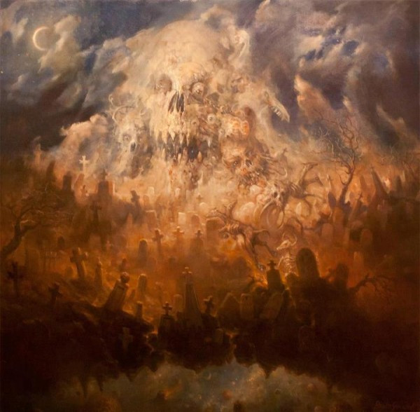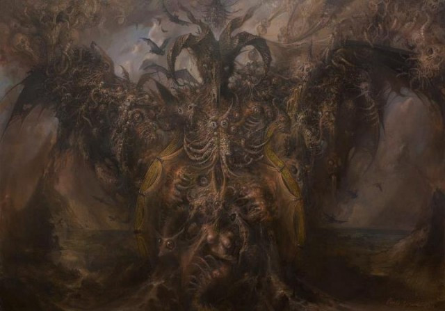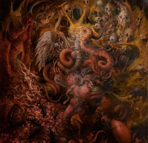 I first came across Paolo Girardi’s name when writing about the Italian nuclear incinerator known as Blasphemophagher (here). Girardi painted the cover art for Blasphemophagher’s latest album, The III Command of the Absolute Chaos, which you can see above. He has painted many more album covers for metal bands, though it took a link from Rev. Will to one of Girardi’s most recent creations to remind me that I intended to explore his work in depth.