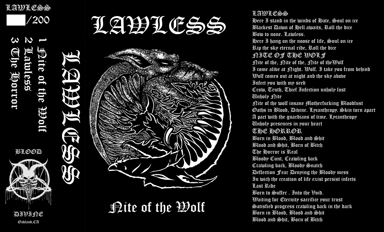 AND guitarist House, bassist Indrio, and Acephalix drummer Dave Benson are also the three members of a band named Lawless, with Indrio and House also sharing the vocal duties. Earlier this month the trio released their first demo under the Lawless banner. Titled Nite of the Wolf, it includes three songs and is available for download at Bandcamp (HERE) for $3, or on tape for $5.90 (limited to 200 copies) from Blood Divine.