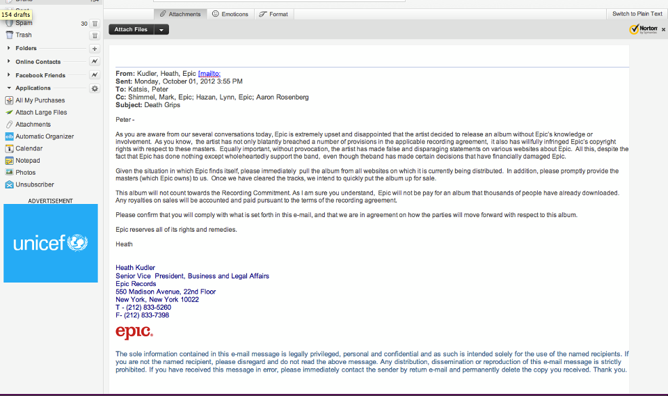 Well, we got our answer to that question not long ago, because Death Grips posted on their Facebook page an image of a confidential e-mail dated October 1 from Epic’s chief in-house corporate counsel to the man who appears to be Death Grips’ manager, accusing the band of breaching their contract and demanding that the free download be stopped and that masters of No Love Deep Web be turned over to Epic immediately. To get a better look at the e-mail, click on the image above and you’ll see a bigger copy.
