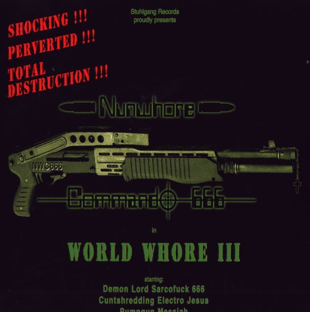 Waaaay back in 1993, in an interview from an issue of Corporal Arts zine (Japan), Olli of GUT alluded to a forthcoming side project named “Nunwhore Commando 666”. It would be ten years of waiting and wondering through the demise of GUT and the rise of Libido Airbag to find out if this mysterious project with an amazing name would ever see the light of day. Finally, with the lo-fi House music/pornogrind party of Libido Airbag winding down after 2 demos and 2 full lengths, 2003 saw the release of World Whore 3, the debut album by a German cybergrind supergroup of sorts featuring members of Gut and Nyctophobic.