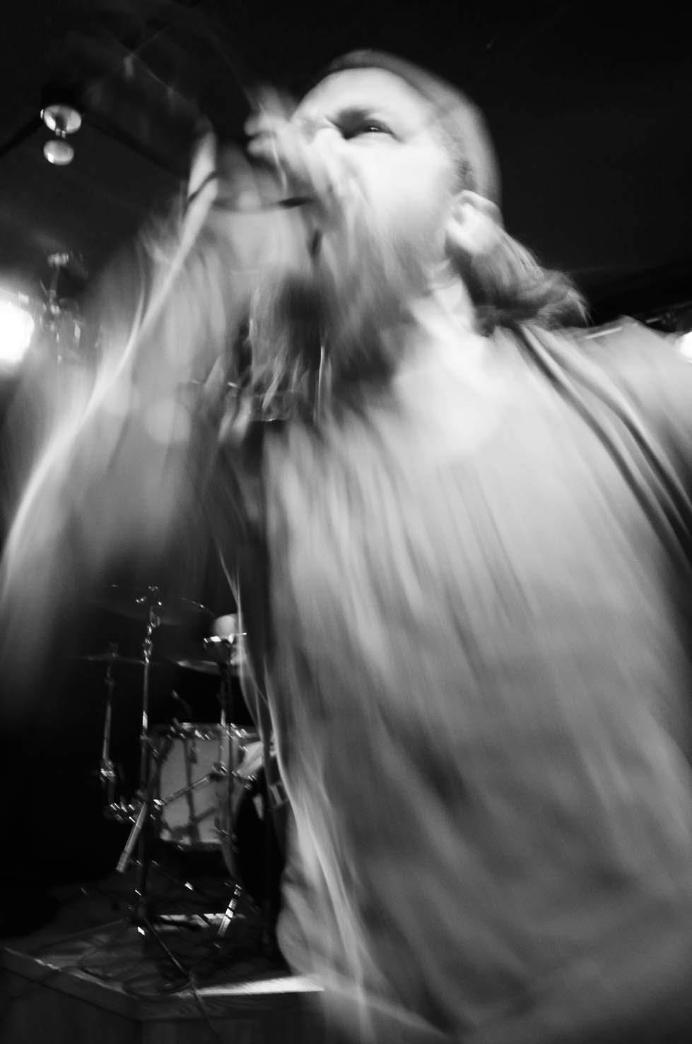Nick Vechery and I made our entrance at Mickey Finn’s Pub partway through Encrust’s set. I had been looking forward to seeing Encrust for some time: their debut, From Birth to Soil, was a solid, rollicking set of sludgy death and roll. I had also heard that they played Obituary off the stage when they opened for them last year. Encrust made their fifteen minutes with me count. The Chicago four-piece rolled me over like a bulldozer, heavy on low end and rhythm. They were still tight after their set at South by Southwest, and obviously made a few fans at the show: myself and others were disappointed that there is no vinyl pressing of From Birth to Soil, and unfortunately the boys hit the road before I had the chance to buy a CD. Their Facebook posts indicate that their second record is nearing completion—I look forward to hearing that material and purchasing it on the shiny black stuff.