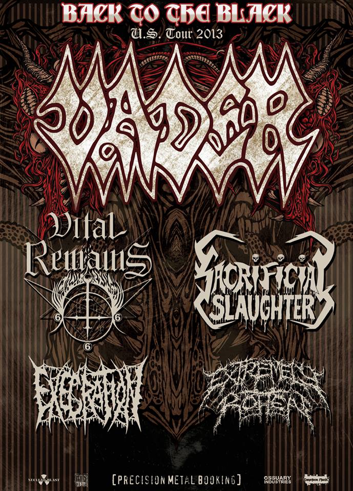 Poland’s magnificent Vader spent the first part of 2013 laying waste to Europe in a tour called Back To the Black. Over the weekend, news surfaced that Vader will now be bringing Back To the Black to the U.S. For support, they will be backed by U.S. death metal veterans Vital Remains, California death/thrashers Sacrificial Slaughter, a Colorado death/black band named Execration, and a bunch of brutal death Floridians named Extremely Rotten.