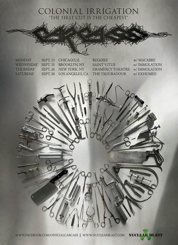 This seems to be a day for tour announcements. In addition to those we’ve already posted about, Carcass have now announced that they will be playing a select group of “intimate” shows in North America this September in support of their forthcoming album Surgical Steel. I like the tour’s name — Colonial Irrigation — though I wonder if maybe it should have been “Colonic Irrigation”. I also enjoyed bassist/vocalist Jeff Walker’s statement about the tour: