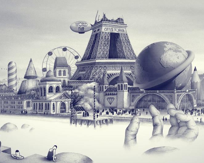 The music is a song called “Rock It For Me” from a new album named Panic by Caravan Palace, a French electro-swing and Gypsy jazz band. The song is jumpin’, but the animation is the main draw for moi. It was co-directed by Guillaume Cassuto, Ugo Gattoni, and Jeremy Pires (aka CRCR). The video takes place at the World’s Fair in Paris during which aliens mount an invasion with enormous beach balls. The government decides to strike back with a giant robot and . . . you can see for yourself what happens after that.