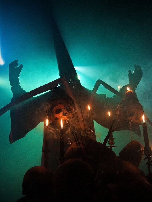 Consider the idea of a Czech black metal band creating an album in homage to the Goddess Kali, the Aghoris, and Hindu funeral rites. With the album and song titles in Hindi. And they perform in embroidered robes and a striking array of strange hoods. Who wouldn’t be at least a little curious about the music? I certainly was.