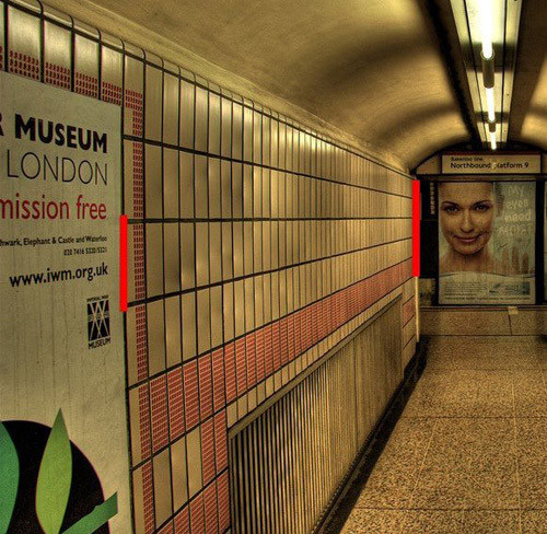 Perhaps the most widely observed example of the Ponzo Illusion is the apparently growing size of the moon as it approaches the horizon (explained here). In the examples below (credit TYWKIWDBI again), the images of the cars are in fact the same size (if you don’t want to get out your ruler, go here for proof), as are the red lines in the second photo.