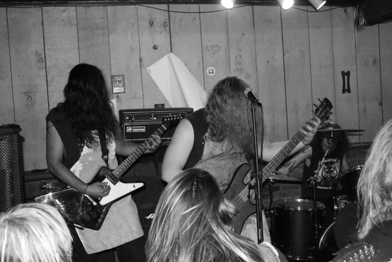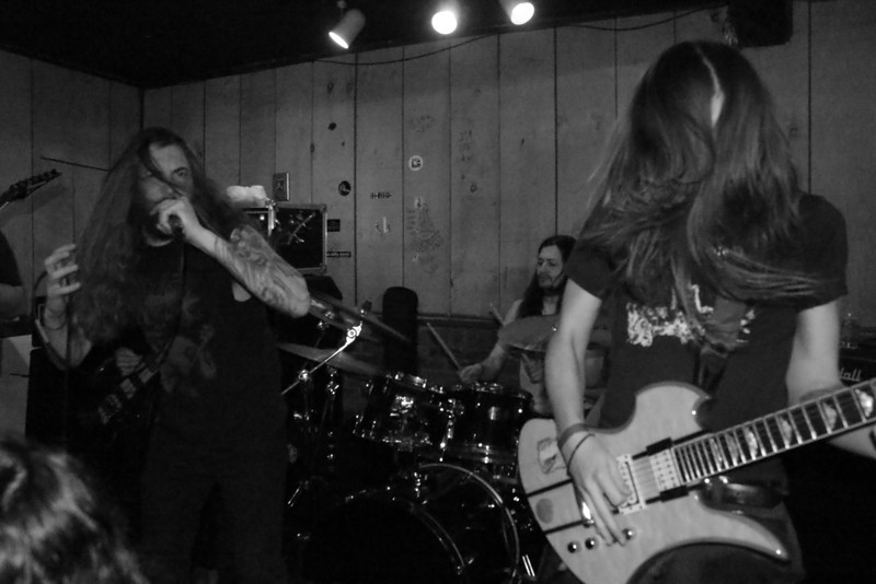 As I mention above, Valdrin have been around for a while under one name or another. They play a brand of black metal that tends towards the melodic, with symphonic parts permeating the music here and there. Some of the rhythms had a sort of “bouncy” feel to them, which when combined with the guitar parts reminded me of dark carnival music (definitely a good thing). The vocalist tended to follow the rhythm as well, which helped the bouncy feel and definitely got heads bobbing in the crowd. But there was plenty of raw aggression to be found in their set as well; their first song began with an eerie, De Mysteriis Dom Sathanas-eque intro and quickly moved into a relentless blaze of riffage, and “Through The Catacombs” had a fantastic moment where the music went into furious riffing, paused for half a second, then exploded in a frenzy of drumming, headbang-inducing guitar, and a skin-searing scream from the vocalist. The effect in our tiny little venue was crushing. Also of note were some impressive solos provided by vocalist and guitarist Carter Hicks.