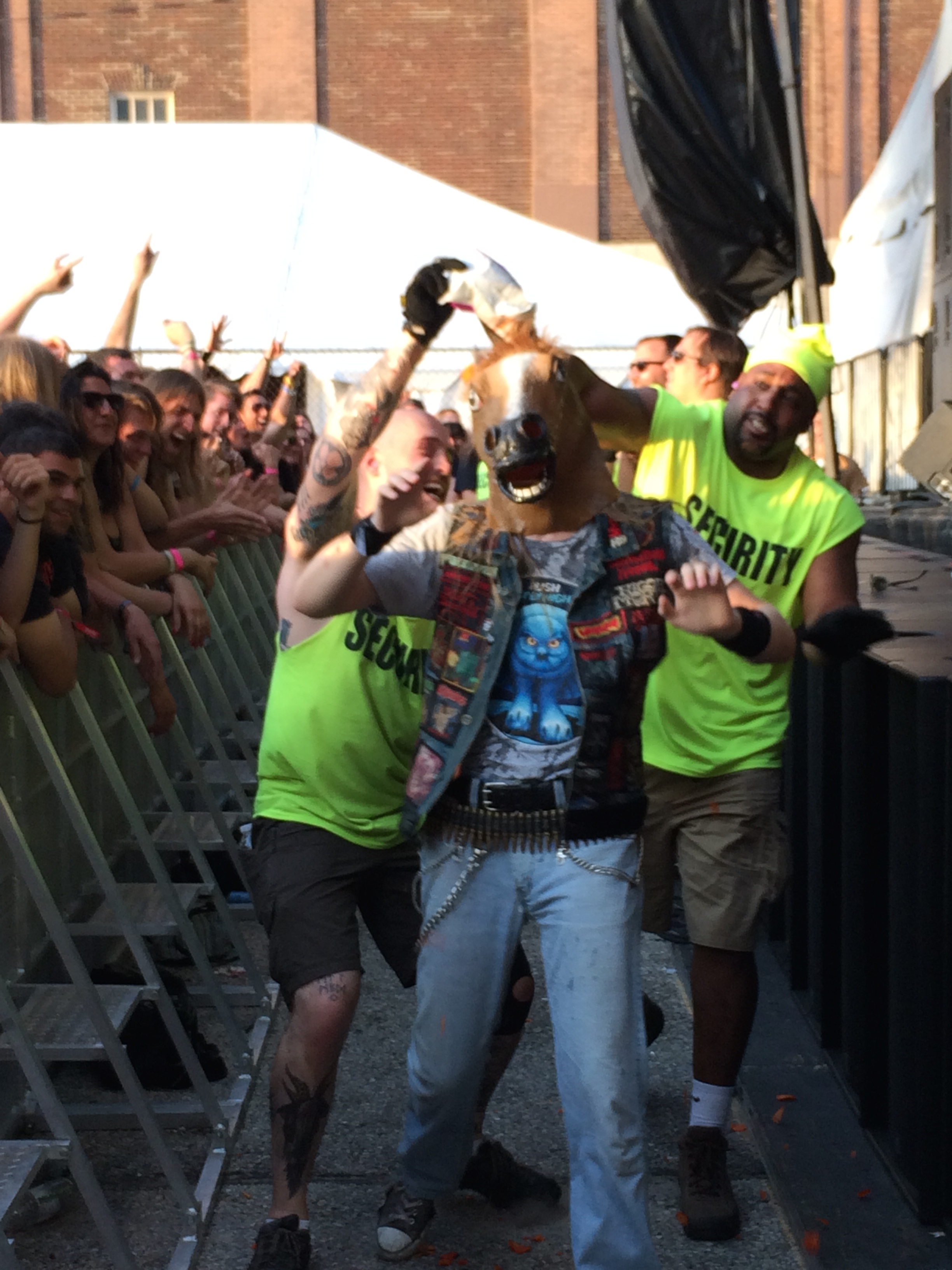People-watching was definitely one of the primary MDF spectator sports, second only to watching the bands on stage. Given that this was like a metal homecoming party (or, as Kim Kelly put it, “metal’s version of Spring Break”), lots of people obviously put a lot of thought and care into their selection of finery — including the dude in the horse-head mask pictured above, just after he had successfully crowd-surfed over the barricade at Edison Lot’s Stage A.  And of course the official mascot of MDF, Chicken Man: