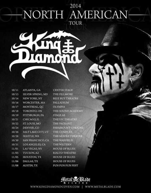 “King Diamond has confirmed what has been rumored for several weeks: the band will return to North America for a full tour this Fall! The tour will wrap up with the previously announced performance at Fun Fun Fun Fest in Austin, TX, and begins on October 11 in Atlanta, GA. A limited edition King Diamond jacket will be available through the SHOWstubs.com fan club presale, which begins tomorrow, June 24th. Tickets will be on sale online and at box offices nationwide on Friday, June 27th.