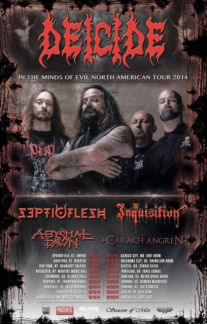 Last month news surfaced about a tour to be headlined by Deicide, named after their most recent album, In the Minds of Evil. Last night Inquisition posted an announcement on their Facebook page about the tour, which was interesting because when the tour was announced last month Marduk was named as one of the support bands, but now it appears that Marduk are out and Inquisition are in. In addition, Abysmal Dawn have been added to the line-up. Here’s the complete list of bands: