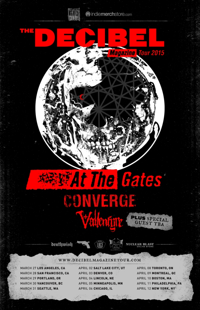 According to reports here and here, the 2015 edition of THE DECIBEL TOUR will include At the Gates, Converge, and Vallenfyre, plus one more band yet to be announced. This news was apparently divulged by Richard Christy on Saturday night on stage during the “Decibel Takes Manhattan” show, which featured Amon Amarth, Sabaton, and Vallenfyre.