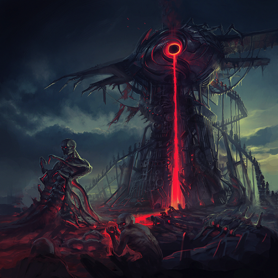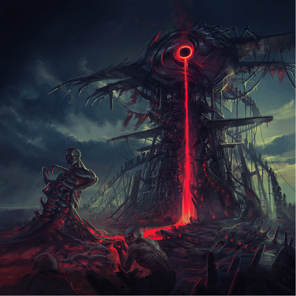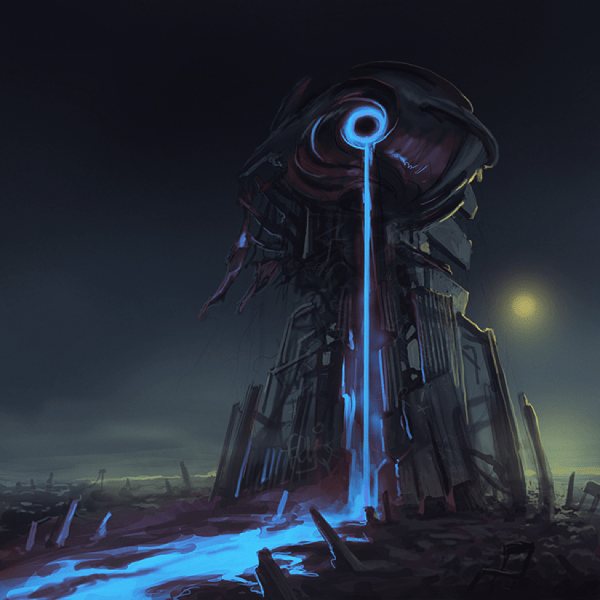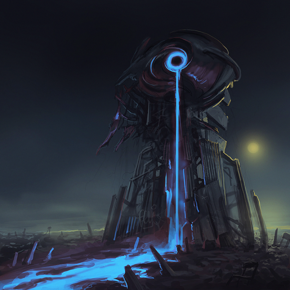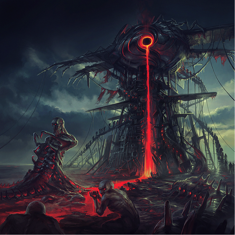 Charles: Pär thought the people should be absorbed by the goo and tried to convey that in this sketch. The sky was starting to look cooler as well. I didn’t really like the religious connotations of the guy praying and felt the guy on the ladder made the structure look smaller. I kept pressuring him to have people be actually fed into the structure somehow haha. He was trying to avoid that, however, since he’s done that on a few covers. At this point I suggested a winding staircase leading into the structure.