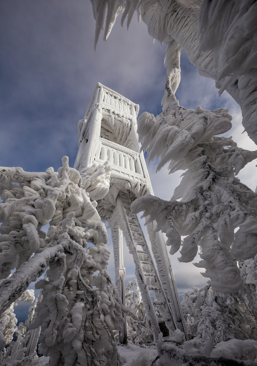 Mount Javornik is part of a mountain range in eastern Slovenia and the location of a popular ski center. High up on the mountain, high winds and freezing fog encase trees and lookout towers in thick layers of ice, creating alien spiked sculptures.