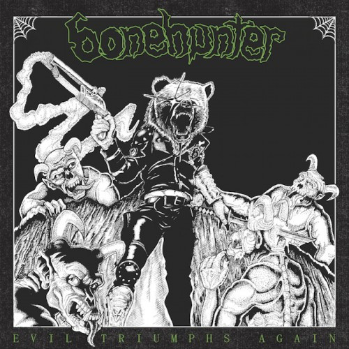Our next song comes from a band from Oulu, Finland, named Bonehunter. Their debut album Evil Triumphs Again will be released by Hells Headbangers on August 12, which is so far away that I can’t think that far ahead. But I’ve circled the date on my calendar because the Bonehunter song that HH premiered in recent days kicks all kinds of ass.