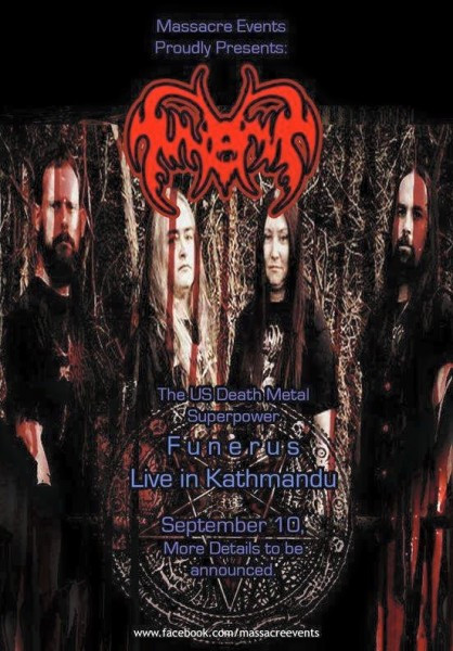 The other piece of recent news, which I also learned from Aabeg Gautam, is that the crushing Funerus — which features frontwoman Jill McEntee and Incantation’s John McEntee, will be playing a concert in Kathmandu on September 10, 2015, as well as a September 9 show in Pokhara. I had the pleasure of seeing the band for the first time at this year’s Maryland Deathfest, and it’s cool that they will be making the trip to Nepal, especially at this time, to show solidarity with our metal brothers and sisters in that ravaged land.