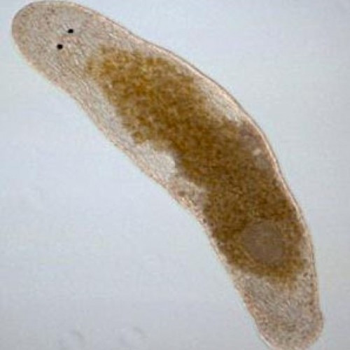 Now let’s move from the sublime to the ridiculous. This is a photo of a microscopic, water-dwelling flatworm called Macrostomum hystrix. It’s a hermaphrodite with both male and female reproductive organs. It can self-reproduce by using a needle-like penis to inject sperm into its own head.