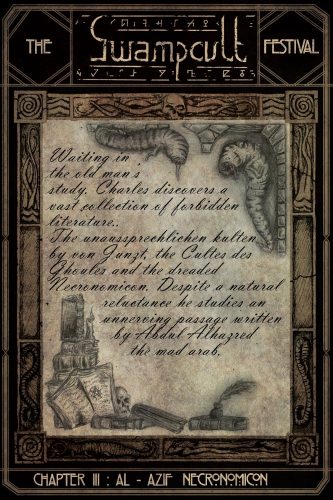 In August of last year we premiered a song from an album called The Festival by the Dutch duo SwampCult. The album was eventually released in October, and both before and after its release it earned substantial praise from metal writers scattered around the globe, excerpts of which appear in a long list at the album’s Bandcamp page. Today we have a reminder of the album for listeners who may not yet have explored it, and a terrifying companion to the music for those who already have: the premiere of a video for the same song we had the pleasure of premiering last August, “Chapter III – Al-Azif Necronomicon“.
