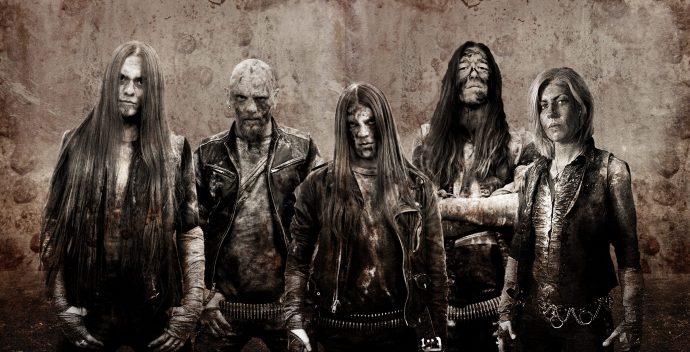 To return to the stylistic fusion that occurs in “Hellwhore“, you get a taste of it fairly soon. While the skittering riff that starts the song and the whirring of circle-saw guitars accompanied by pummeling percussion that follows it signify thrashing black metal savagery, the music soon jumps to a highly infectious jolt of black ‘n’ roll. And the band’s exuberant taste for switching gears doesn’t end there, as they move from rocking out to a union of jabbing riffs, pulsating bass, and the flickering of symphonic keys, only to then slow the pace with a stomping beat and a dismal, slithery guitar lead.