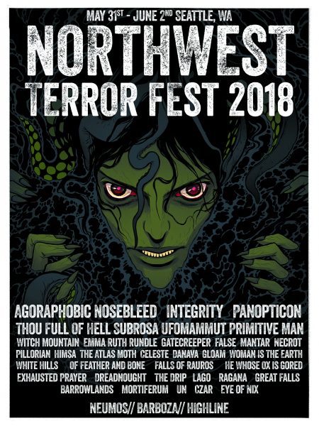 And now, let’s talk about that line-up. As you can see, thanks to the festival poster created by Becky Cloonan, the three headliners for the three nights of NWTF 2018 are Panopticon, Integrity, and Agoraphobic Nosebleed. They are supported by a stellar group of other bands, and we’ve organized them all below according to the dates of their performances and the venues.