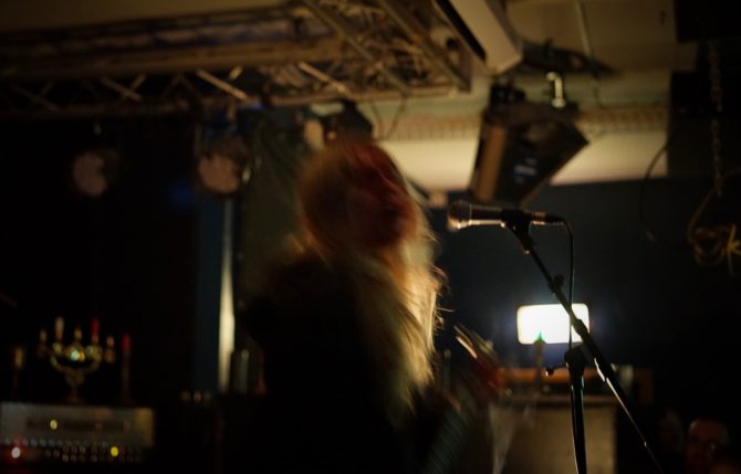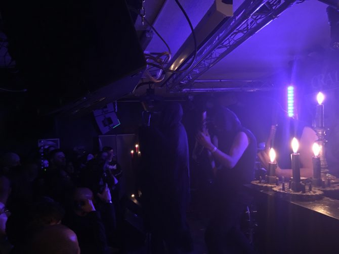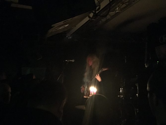 On a pitch-black stage in the near-black music space of Húrra, a man slowly lit candles and sticks of fragrant wood or incense. Sortilegia played only to the light of those candles, set on a table next to the microphone stand. It caused Koldovstvo’s long blonde hair and blood-streaked face to come in and out of the shadows as she moved, like a wraith, the rest of her form completely covered in a long black cloak with the hood thrown back. It truly was a haunting thing to see… and the music was frightening as well.