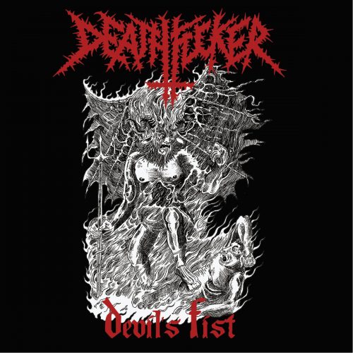 I expressed the wish that both of those releases would become available digitally, and since then they have (via Bandcamp), and there’s more good news: Deathfucker have a new EP headed our way in early 2019. The name of this one is Devil’s Fist, and the title track was revealed late last month. (It also appears that the band’s original duo of guitarist/vocalist Insulter and drummer J.K. have been joined by a bassist/backing-vocalist named Pëst).