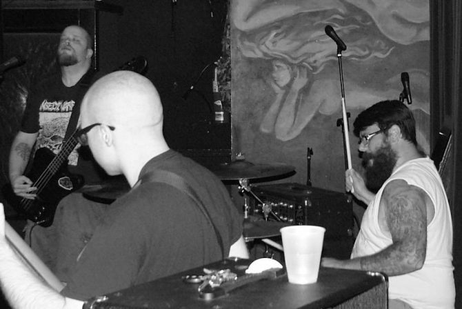 This particular track doesn’t rampage. It’s more of a lurching stomp at first, but then segues into a giant, jumping, body-moving rhythm with a fat riff that’s an unabashed crusher. The prime instrument is the bass, which is so distorted that it qualifies as toxic waste, though there’s also a shrieking, wailing, brain-boiling guitar solo that spears out of the bass-led demolition job and does indeed sound eldritch. The drumming amplifies the physical compulsiveness of the track, while the raw, blood-spraying quality of the roaring, howling, and screaming vocals could very well be a field recording of subterranean ratmen gone insane.