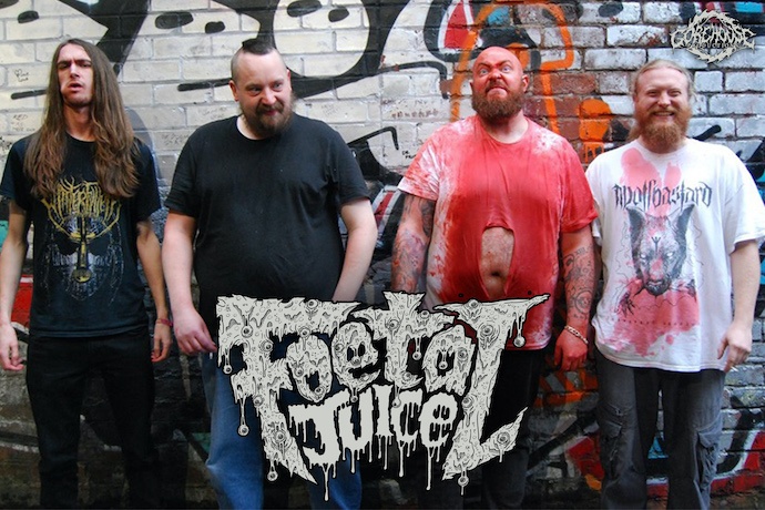 For those who might be encountering Foetal Juice and their twisted black humor for the first time, let us also share with you a few words from the band’s bio: “Since 2005, the Manchester-based quartet has been hard at work in the Extreme Metal Underground scene. FOETAL JUICE is a band with a passion for the gory and perverted side of life, introducing black humor and pure horror with subject matter including strange sects of nuns who piss in the font and eat their own shit as a form of worship, and creepy barflies that wait till women leave then furiously sniff their seats to inhale the sweet pheromones.”