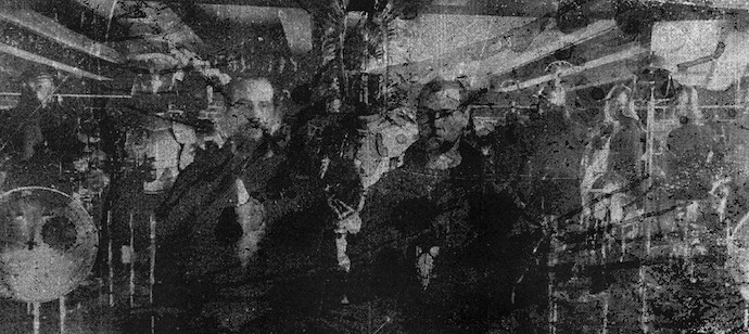 “Unbowed Wolves” is marked by the sharp crack of the channel-shifting drums and a malicious, scalding voice, which rises to frightening screams. The layered guitars channel an otherworldly aura, while at the same time generating an instinctual physical response. The music is sinister, but becomes spectral as the drums vanish, the bass moans, and the guitars ring in bleak and haunting tones. But with a terrifying howl the music boils over again, driven by riotously surging percussion and guitars that radiate a blazing and brilliant light. And then that extravagant sound subsides and seems to transform into a mystical sensation in which solemn choral voices can be heard.