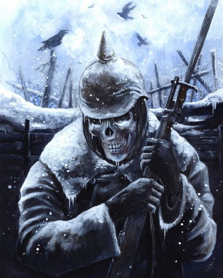 The EP’s two songs are named “Der Füsilier I” and “Der Füsilier II“. You can listen to the first one now (with a lyric video) in advance of the EP’s release by Noisebringer Records on November 19th. The lyrics focus on the death that visited the German-Austro forces in the snow and bitter mountain cold as they escaped from the enemy in Galicia.