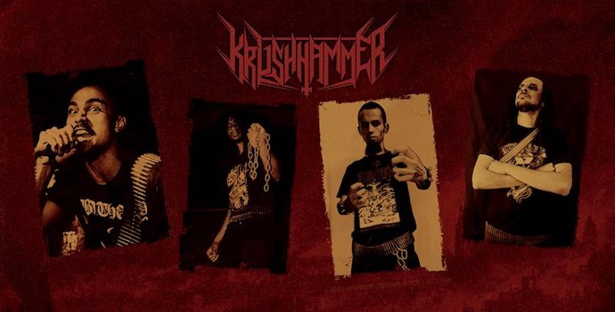 There’s no pretension in that name. It functions as a blunt instrument, and doubles down on the concept — not just a hammer, but a hammer that KRUSHES (rather than “crushes”, because “K” is unmistakably harder than “C”). It signals not tenderness or refinement but mania and destruction. And lest there be any doubt, these Brazilians from Belo Horizonte named their forthcoming debut album Blood, Violence & Blasphemy — which follows a debut EP named Speed Blacking Hell.