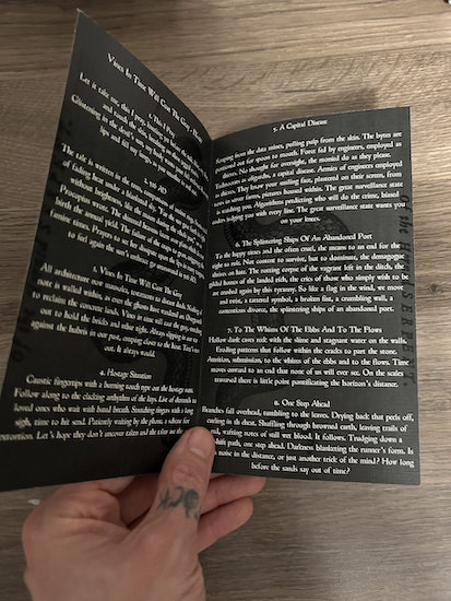 The sounds themselves in this track, an amalgam of caustic black metal and dense noise textures, are also fast-paced and head-melting. They’re ruthlessly scathing, an unceasing squall of ruinous abrasion, like a hurricane-driven sandstorm, threaded with shrill siren-like tones whose feverishness adds to the track’s aura of violent madness.