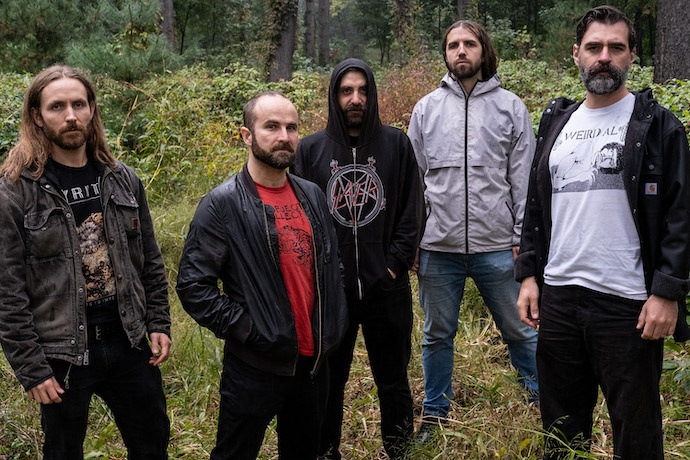 Upheavals begin in the lower end and the vibratory riffing begins to burn and writhe, and to burrow like drills. The guitars also wail like beseeching apparitions in the midst of percussive bombardments, adding to the song’s manifold expressions of terror and hopelessness.