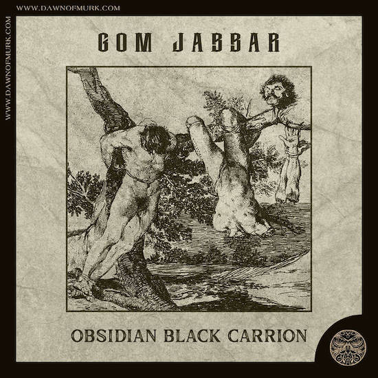 This song, “Was Murdered“, is the opening track of a three-track collection of Gom Jabbar‘s first demos, collectively named Obsidian Black Carrion. It will be released by the Darkwoods label on June 5th. (Gom Jabbar is the solo project of Joseph Edward Kelly from the band Penny Coffin.)