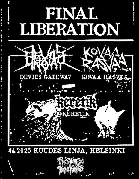 Also as mentioned earlier, the band have expanded from a duo in preparation for live performances slated to begin in April 2025 (see the poster below!). The new members are: Timo Ketola (Caskets Open) on bass, and Jennika Vikman (Unearthly Rites) and Kaino Tervahauta (Ruusuriimu) on guitars. Hanna Virranpää will still take care of the vocal duties, and Harri Kuokkanen will reign over the drum kit.