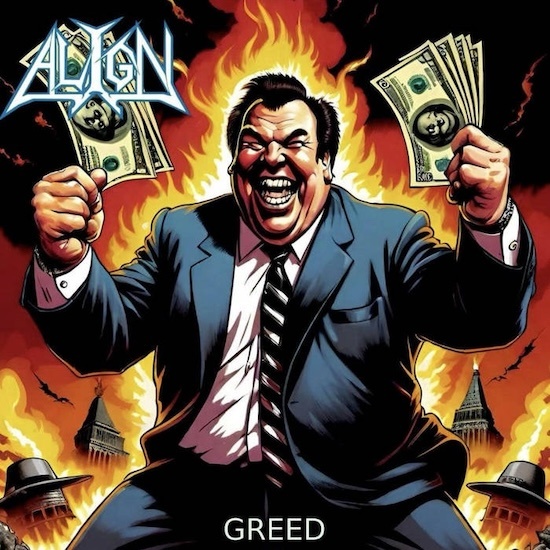 A jubilant bulging plutocrat brandishing bills while everything burns. A song called “Greed”. Align wrote and recorded it before the economic catastrophes of the last few days, but the signs were already there to see, weren’t they?