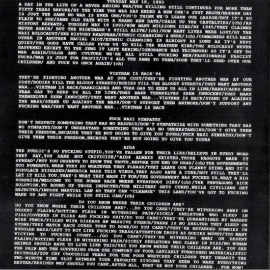The lyrics for the Fuck Nazi Sympathy EP, just like Remember Us to Death, contain some lines that delve into much of what has been dealt with thematically in the work of Znous and that’s why a picture of it from the same embed link of the YouTube video is included above. Instead of cropping it for relevance the whole block is displayed and so a caveat has to be added.