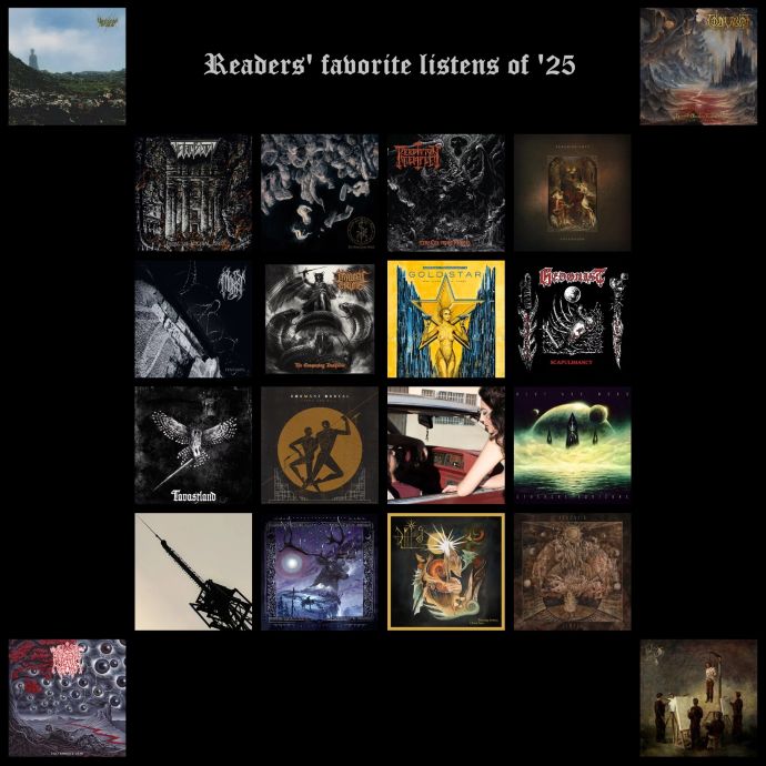 (Our South African contributor Vizzah Harri decided to follow up our 2025 LISTMANIA series with a monumental listmania of his own, which includes various list-assembling calculations and his abundantly illustrated thoughts about three groups of albums he chose to highlight in his own inimitable fashion, respectively anchored in each section by discursive reviews of releases by Demonic Death Judge, Melpomene, and Imperial Triumphant.)