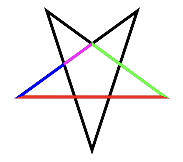 Mathematicians and musicians alike have spent innumerable hours contemplating the properties of the golden ratio, square root of 5, adding one and then divided by 2 equals 1.618… or phi. Little did they know that the only trve music is that of metal, seeing as the people’s free encyclopedia tells us that “a pentagram, or five-pointed star polygon, whose geometry is quintessentially described by φ (phi). Primarily, each intersection of edges sections other edges in the golden ratio. The ratio of the length of the shorter segment to the segment bounded by the two intersecting edges (that is, a side of the inverted pentagon in the pentagram’s center) is φ.”