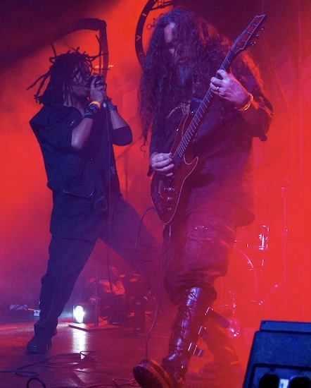 Violent madness and mutilating horror reign supreme — until the music shifts, creating a phase of tragic but also infernal grandeur. Bells toll; the drums momentously boom and stomp; the music sounds both anguished and exotic, swaying like a cobra and soaring as it carries an Eastern melody. But here too, the riffing becomes feverish and the vocals fervent in their fury or torment.