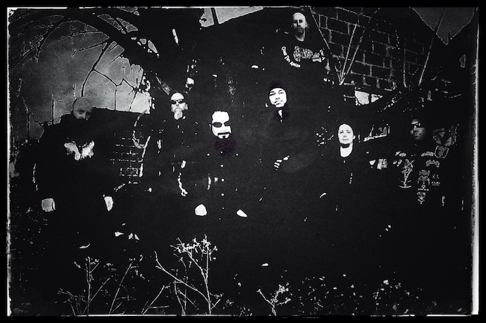 This long song we’re now premiering begins with the sounds of soldiers marching, machine-guns firing, and bombs detonating — and then the music creates its own war zone. Abrasive guitars feverishly fire like automatic weapons; the percussion delivers cannonades; eerie wailing tones cascade overhead and others scream in frenzied convulsions; in the vocal department, wild shrieks and vicious roars explode.
