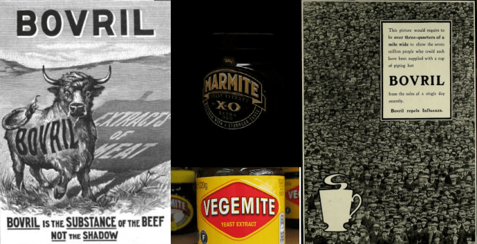 Marmite and Vegemite sandwiched by Bovril (images © to Andrew Smith and Willis Lam/Wikimedia Commons/CC-BY 2.5)