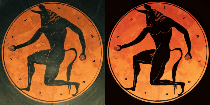 Rɡyaɡ̇dźé! album cover Right with the original on the Left: The Minotaur on a tondo of an Attic bilingual kylix, ca. 515 BCE, National Archaeological Museum of Spain no. 1999/99/80 (image © Marie-Lan Nguyen/Wikimedia Commons/CC-BY 2.5)