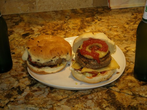 Niek went on to create the stuff, and he put up links to burger photos in his NCS comments. Well, that pushed me over the edge — those babies looked so fucking good that I had to follow suit.  I hunted down almost all the required ingredients, including the Grolsch beer that Niek included in his burger photographs, and I and 3 other ravenous gluttons made those burgers and wolfed them down for dinner. (I wrote about the whole experience here.) So far so good (and man, those burgers were awesomely good).